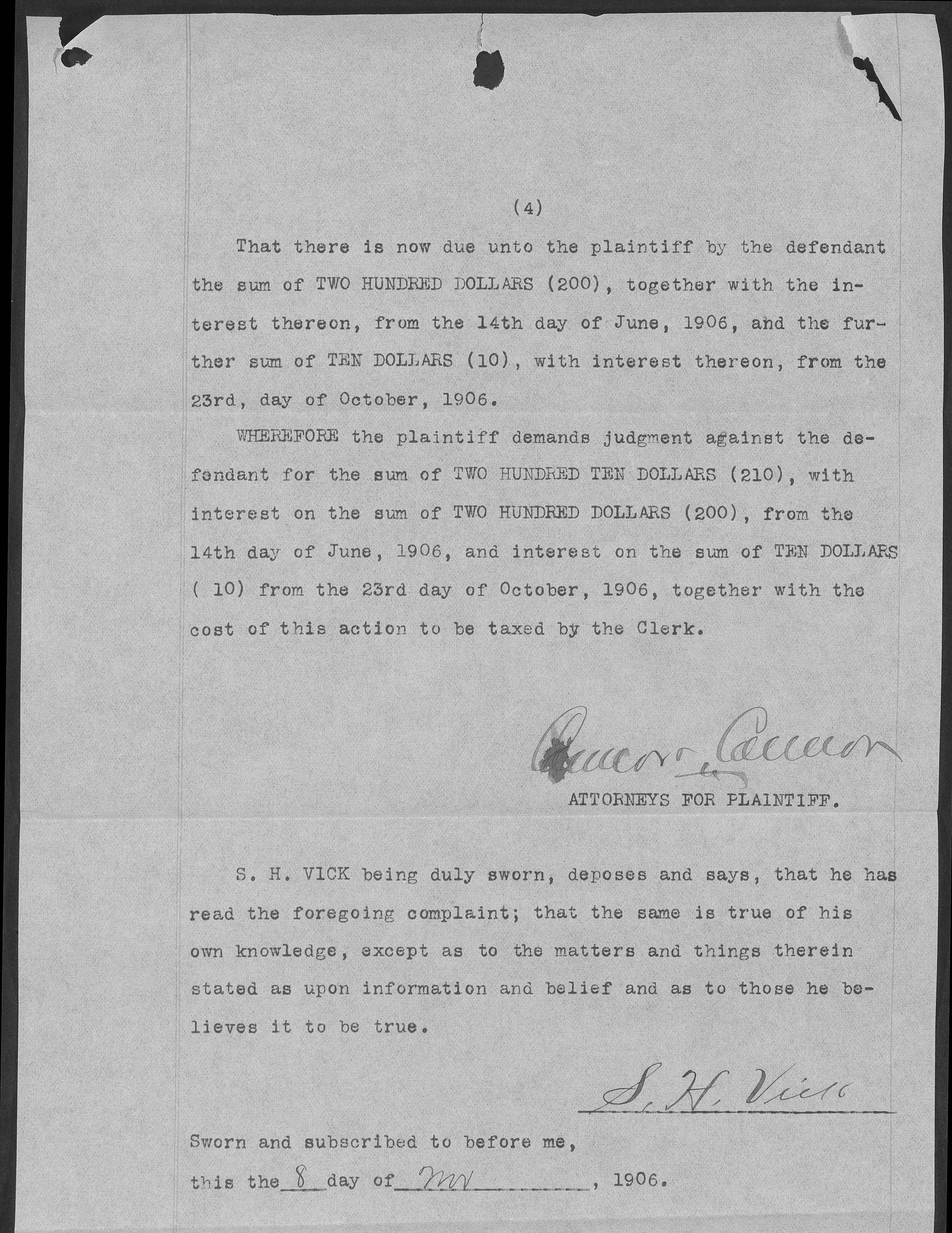 In November 1906, Samuel H. Vick sued Henry E. Hagans of Goldsboro, North Carolina, for a $210 debt — two personal loans Vick had made to Hagans earlier in the year. Hagans did not file an answer to the complaint, and a judge entered a default judgment.